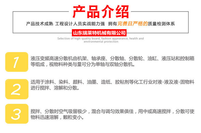 該設(shè)備采用變頻防爆分散機(jī),高速分散的用途是把極細(xì)微的固體粒子加入液體中,做成懸浮粒子,懸浮粒子的特性是微細(xì)粒子不受地心引力而沉淀;機(jī)架升降采用液壓傳動,升降平穩(wěn)可靠,機(jī)架可以回轉(zhuǎn)360度,能一機(jī)多缸使用。