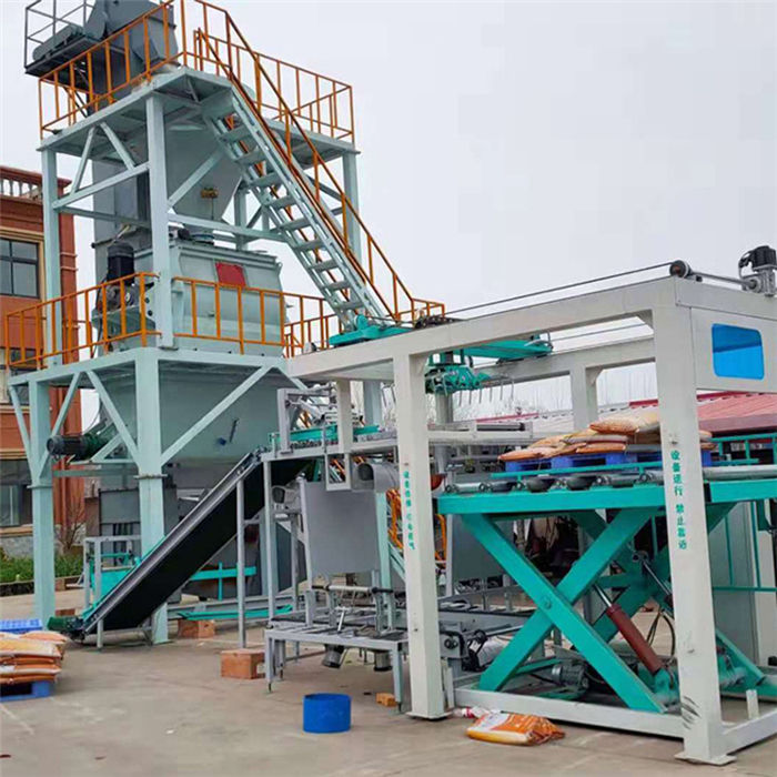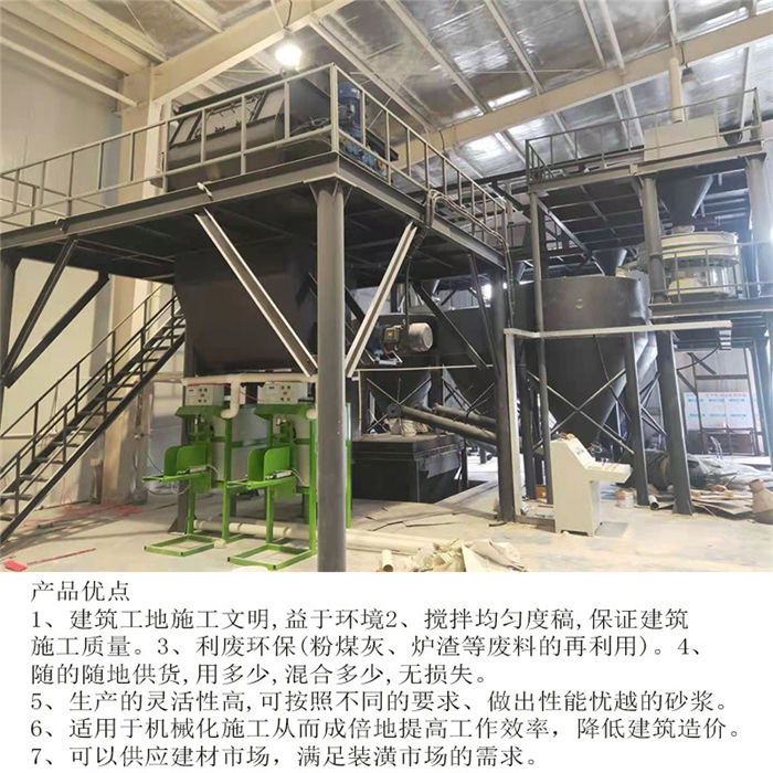 四、混合系統采用4立方大容量無重力雙軸高效混合機,混合時間短,混合精度高,混合速率3-5分鐘一批。高效生產的同時,確保成品砂漿實用效果無虞。